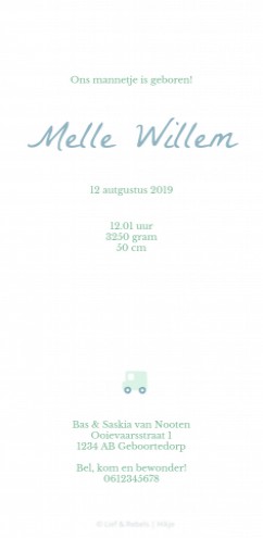 Super stoer geboortekaartje in Scandinavische stijl met autootjes. Dit kaartje is een mooi rustig kaartje met simplistische tekeningen. Less is more! Dit geboortekaartje komt goed uit op klassiek extra dik papier maar ook het gladde van zijdeglans kan hier heel mooi bij staan. Ontwerp het kaartje helemaal naar wens en pas zelf je teksten aan. Tip: bestel altijd even een proefkaartje om te kijken hoe het kaartje is geworden. Het eerste kaartje kan je gratis bestellen!
