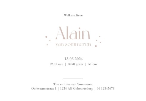 Neutraal geboortekaartje met een minimalistisch geillustreerd vogeltje met een takje in de snavel. Ontworpen met een mooie stippenwolk en rustige beige tinten. Extra mooi door een van onze folie kleuren aan het kaartje toe te voegen.