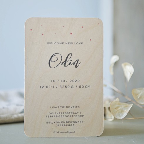 Ook van een geboortekaartje op echt hout kan je een proefkaartje ontvangen. Gebruik hiervoor de kortingscode voor een gratis proefkaartje en betaal alleen de toeslag van € 5,-