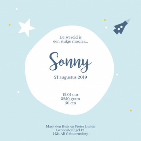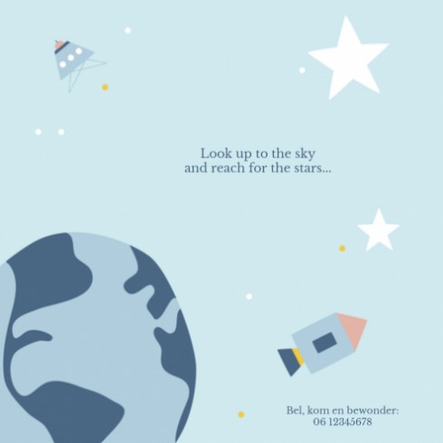 De stijl van Hikje is heel herkenbaar en zo leuk voor geboortekaartjes! Lief, vrolijk en minimalistisch. Dit geboortekaartje met raketten, planeten heeft een super leuke ruimtevaartthema. Echt leuk voor een stoer mannetje! Dit kaartje komt heel mooi uit op een luxe wit of klassieke papiersoort. Zeker een geboortekaartje waar je mee opvalt en tijdloos is. Ontwerp dit geboortekaartje zelf, pas de teksten naar wens aan en bestel een gratis proefdrukje.
