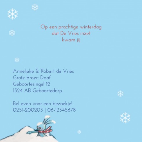 Een prachtig winters geboortekaartje met een kindje op een slee. Hebben jullie twee kindjes? Bekijk dan de varianten van dit kaartje, we hebben dit kaartje ook met een broer en een zus.