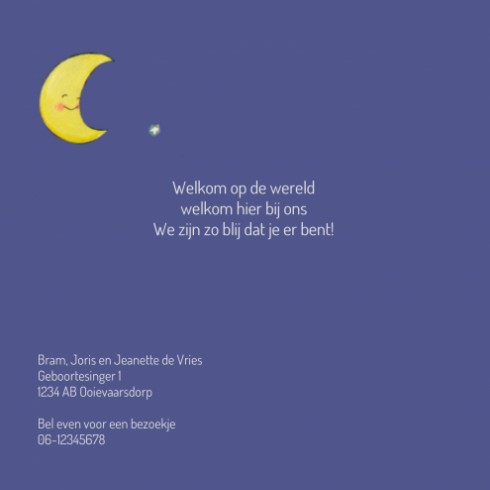 Een lief geboortekaartje met op de voorzijde een wiegje met daarin een klein jongetje. De geschilderde geboortekaartjes van Jeanette zijn prachtig op Luxe wit of klassiek papier. Maak jullie kaartje op en bestel direct een gratis proefkaartje.
