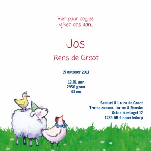 Alle dieren verwelkomen een tweeling. Een stoer en lief geboortekaartje met boederijdieren zoals schaap, varken, kip en eend. Pas zelf de teksten aan en bestel een GRATIS proefkaartje.
