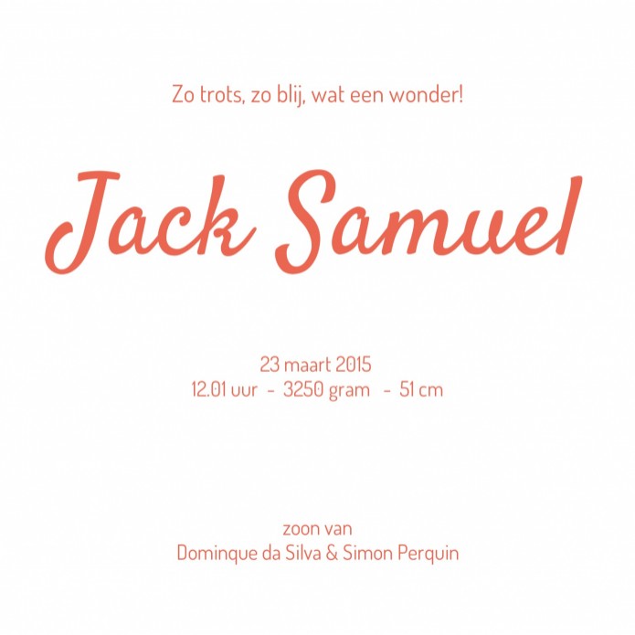 Wat een lief kaartje, voor een blij jongetje! Dit prachtige geboortekaartje straalt door zijn eenvoudige en lieve afbeelding. De volle oranje-rode kleur is zonnig en vrolijk. Maak deze kaart snel op met jouw gegevens en bestel gratis een proefdruk. En wil je een andere afbeelding - deze kun je gemakkelijk kiezen uit de beeldbank!