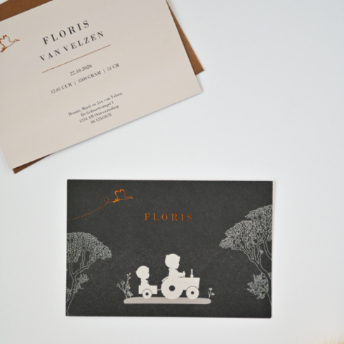 Samen met zijn grote broer op de tractor. Een stoer kaartje met een speelse touch. Helemaal naar wens aan te passen.