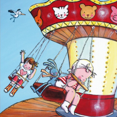 Een vrolijk geboortekaartje met de baby samen met een grote broer in de draaimolen. De prachtige geboortekaartjes van Jeanette zijn geschilderd. Kijk voor andere gezinssamenstellingen bij de varianten.