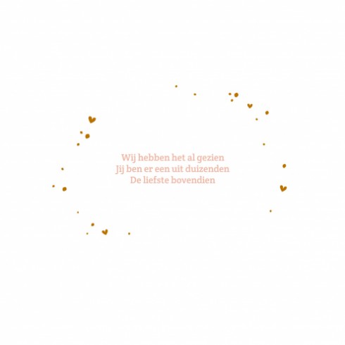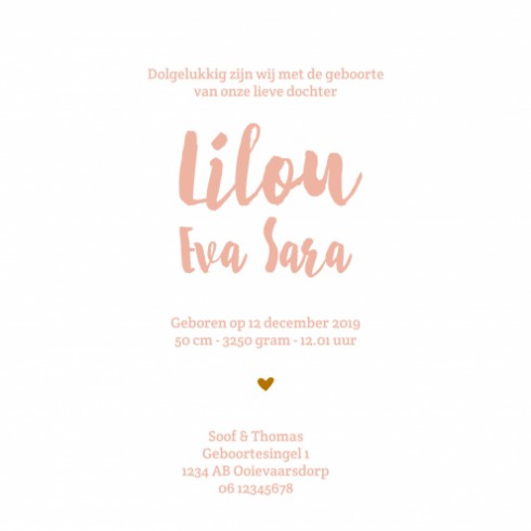 Dit prachtige kaartje hebben wij in december 2016 voor Lilou van Mama to the Max mogen ontwerpen. Het kaartje is voorzien van een speels letterype dat omringt wordt door stipjes en hartjes. De hartjes zijn met een gewenste foliekleur te bestellen. Zo is de combinatie van het zacht roze met koper of goud erg mooi! Het kaartje is natuurlijk helemaal naar wens aan te passen door de naam op de voorkant en tekst aan de binnenkant te wijzigen. Dit geboortekaartje is extra mooi op klassiek papier (voor folie), omdat het een mooie kleur en structuur heeft.