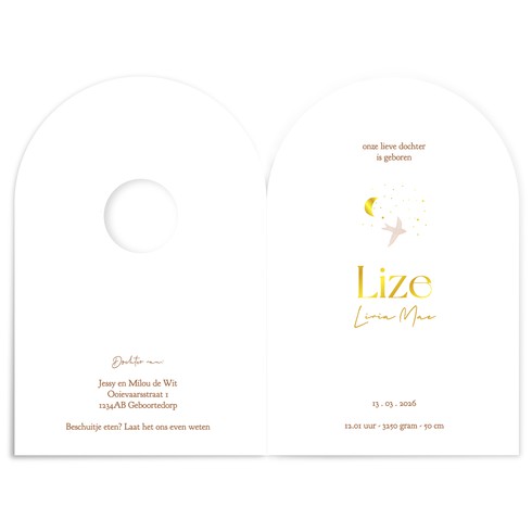 Lief geboortekaartje meisje in een bijzondere dubbele boog vorm. Met een rond doorkijkje met een leuk maantje en vogeltje hierin. Opgemaakt met de kleur voor het glanzende goudfolie.