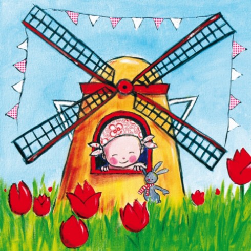 Daar ben ik dan! Een kleine Hollandse meid in een molen. Met de tulpen is dit een echt Hollands geboortekaartje.