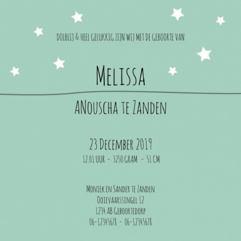 Een eenvoudig geboortekaartje met daarop de prachtige tekst: "I love you to the moon and back". De kaart is in verschillende hippe kleuren verkrijgbaar en zowel in het Nederlands als in het Engels.