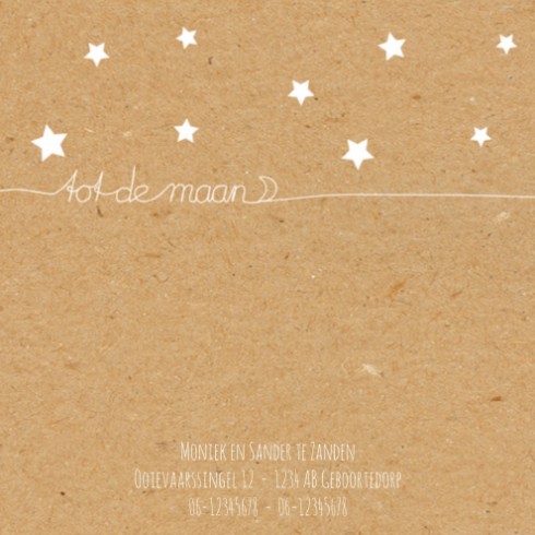 Een eenvoudig geboortekaartje met daarop de prachtige tekst: "Ik hou van jou tot de maan en terug". Deze kaart is met zijn kraft achtergrond niet alleen lief maar ook nog eens heel stoer!