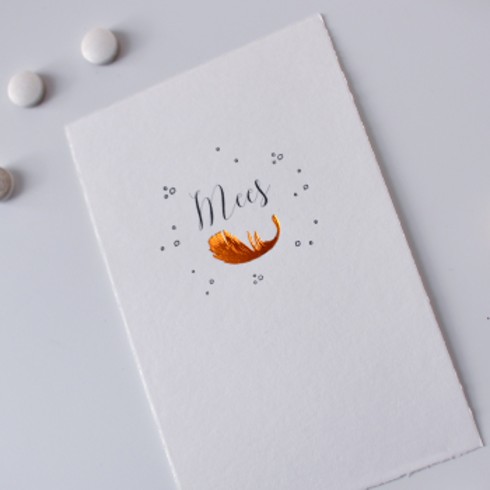 Leeg kaartje met koperfolie stempel met veertje op Oud Hollands geschept papier. De hartjes zijn reeds voorgedrukt. Je hoeft deze kaart alleen nog maar door ons te laten opmaken en te laten indrukken in 1 of 2 kleuren naar keuze.
